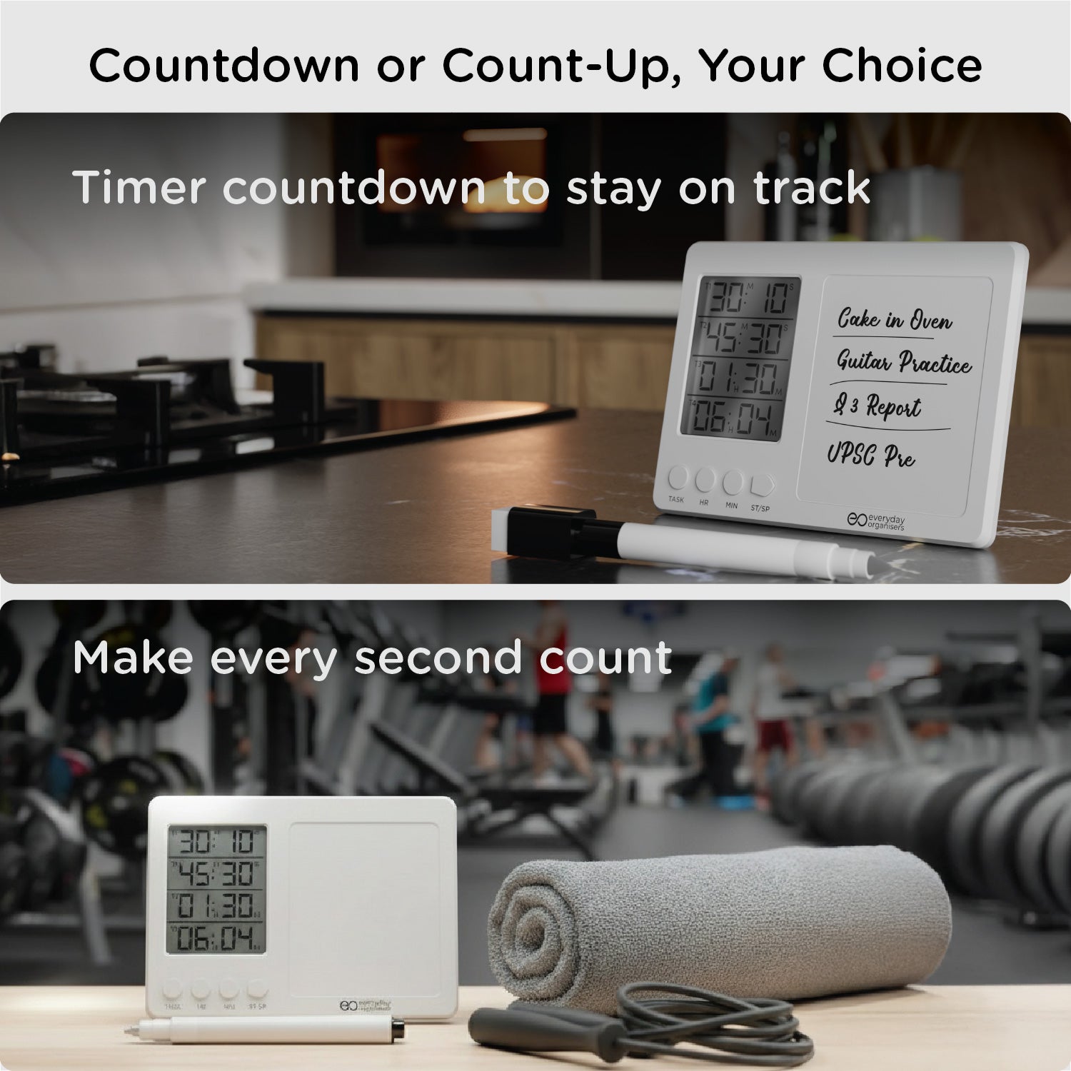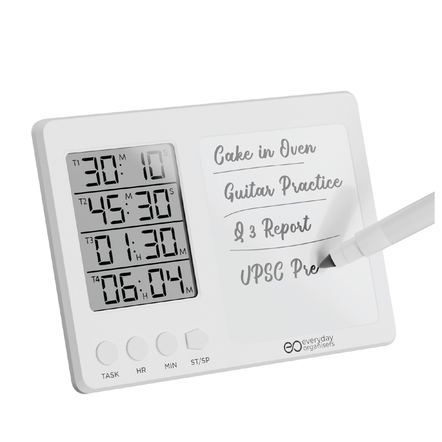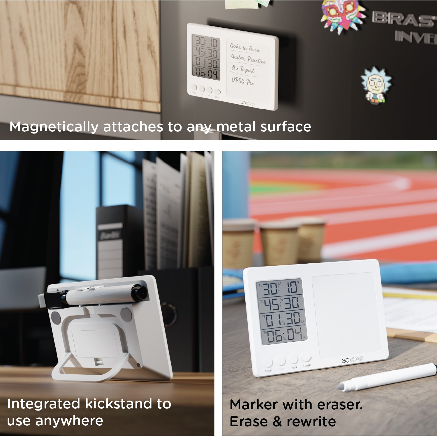 The eo Time Board is your all-in-one focus tool — combining a 4-in-1 digital timer + stopwatch system with a writable, erasable magnetic whiteboard.